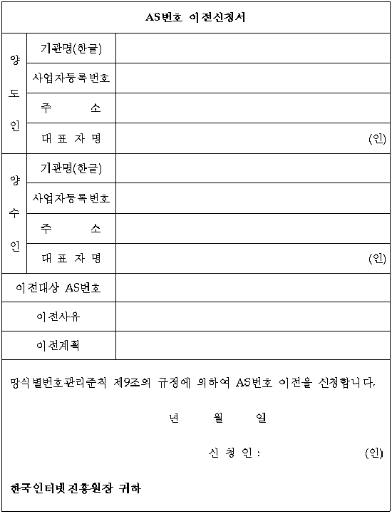 1. AS번호를 할당받고자 하는 자는 준칙 별지 제1호서식에 따라 할당신청서를 진흥원에 제출하여야한다.