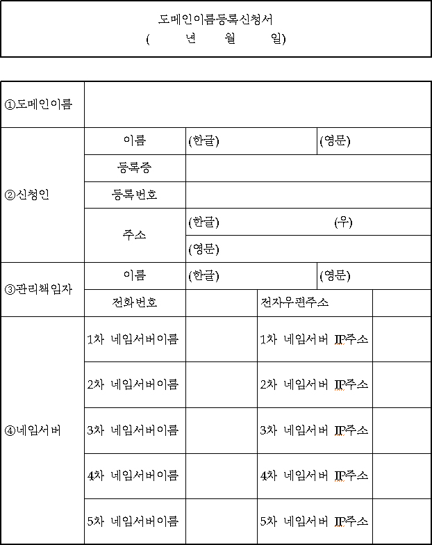 제9조(도메인이름등록신청서) 인터넷주소자원에 관한 법률 시행령 제11조의4 규정에 의한 도메인이름등록신청서는 별지 제1호 서식으로 한다.