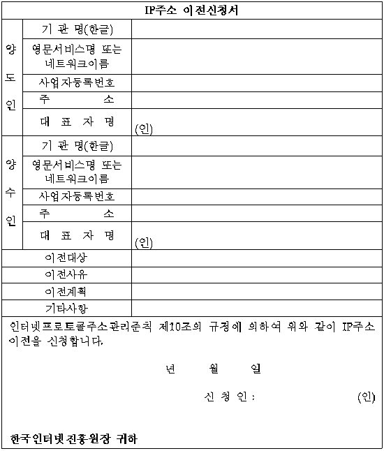 인터넷프로토콜주소관리준칙 제16조의2 규정의 의하여 관리대행자 이전을 신청합니다.