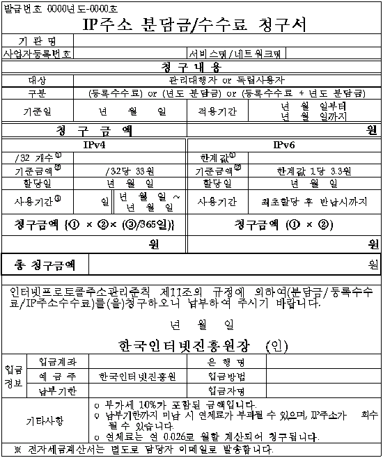 발급번호 0000년도-0000호 IP주소 분담금/수수료 청구서 |