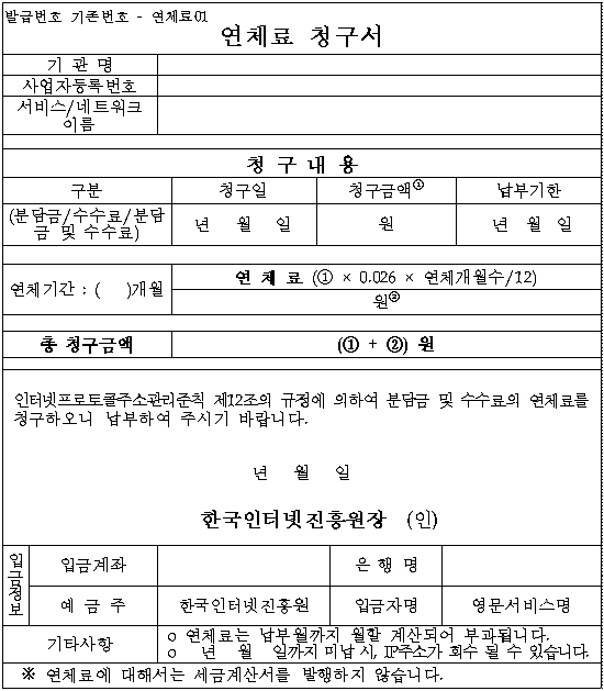 인터넷프로토콜주소관리준칙 제12조의 규정에 의하여 분담금 및 수수료의 연체료를 청구하오니 납부하여 주시기 바랍니다.