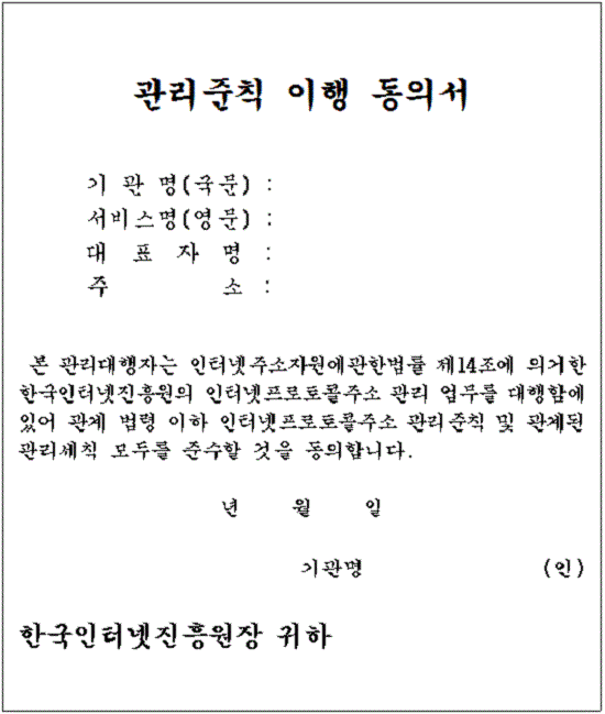 - 1. 관리대행자가 사용자에게 IP주소를 할당하고자 하는 경우 별지 제2호서식에 따라 할당승인신청서를 진흥원에 제출하여야한다.