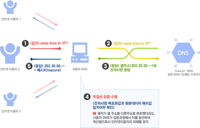 DNSSEC(DNS Security Extensions)은 이와 같은 "데이터 위-변조 침해공격"에 취약한 DNS의 문제점을 근본적으로 보완 개선하기 위해 국제인터넷표준화기구인 IETF에서 1990년대 후반부터 논의를 시작, 2005년경 완성된 국제표준기술로, 다양한 시험을 거쳐 2010년에는 전세계 최상위 DNS인 ‘루트DNS’에도 적용되면서, 전세계적으로 적용이 확대되고 있습니다.
