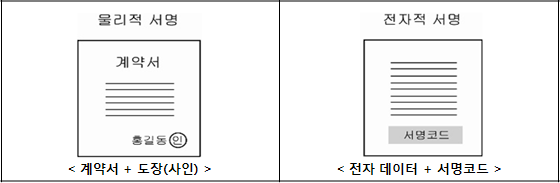 | 계약서 + 도장(사인) | 전자 데이터 + 서명코드 |