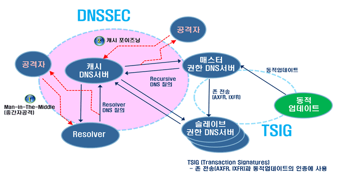 DNSSEC은 인터넷 상의 도메인에 대한 DNS 질의응답 절차 가운데 발생할 수 있는 "DNS 데이터 위-변조" 공격에 대응할 수 있는 보안기술입니다. 권한 DNS서버 간 존 데이터 전송 또는 동적업데이트와 같은 네임서버 관리영역의 동작에 대해서는 별도의 공유키 암호화 방식인 TSIG 기술을 사용하여 보호체계를 적용할 수 있습니다.