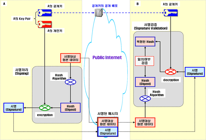 o A는 "원본데이터"에 "서명" 데이터를 부가하여 인터넷 경유하여 B에게 전송