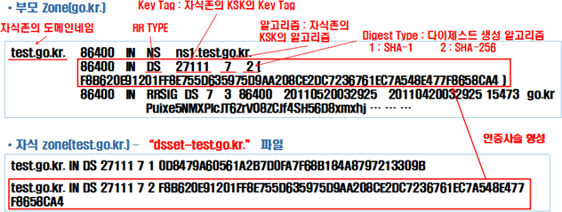 자식존의 DS 레코드가 부모존에도 똑같이 존재하며, 이 DS 레코드로 자식존과 부모존 사이에 인증사슬이 형성됩니다.