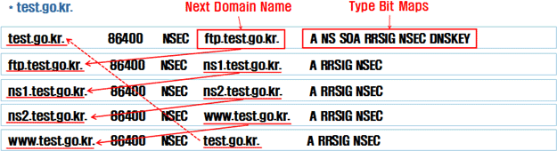 NSEC 레코드는 순차적으로 연결되어 있습니다. N번째 레코드에서 N+1번째 레코드의 도메인 이름이 지정되어 있고, 마지막 레코드에는 첫번째 레코드의 도메인 이름이 지정되어 있습니다.