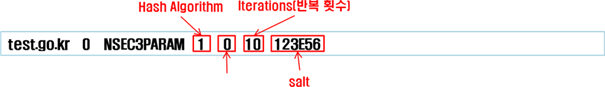 NSEC3 리소스 레코드를 사용하는 경우, 서명처리 과정에서 NSEC3PARAM 리소스 레코드가 자동으로 산출되어 추가 설정됩니다. NSEC3PARAM 리소스 레코드는 NSEC3 리소스 레코드의 도메인네임 부분을 어떤 방식으로 해쉬 처리할 것인지를 지정하는 인자값(parameter)을 설정하여, 매스터 및 슬레이브 네임서버, 캐시 DNS서버에 알려주는 역할을 합니다.