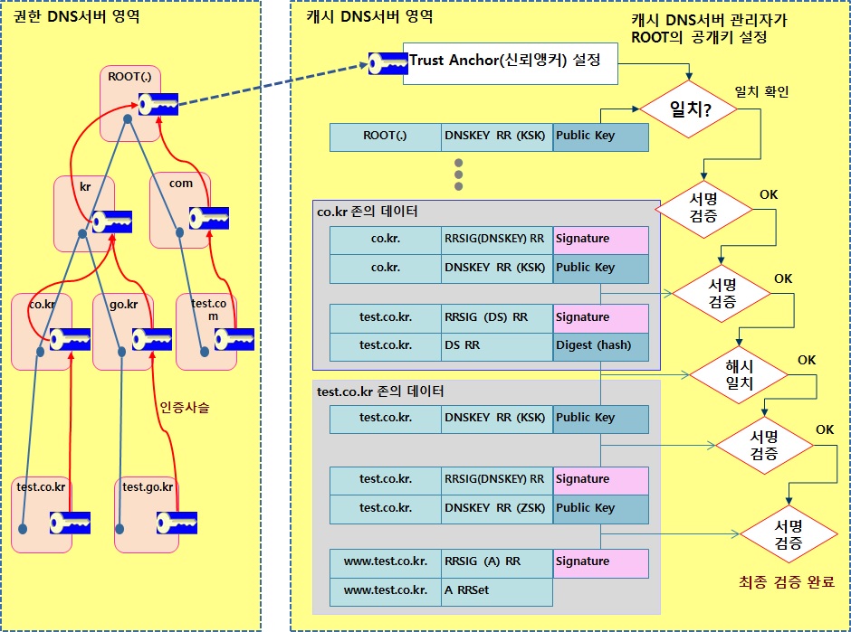 도메인 test.go.kr. 를 예로들어, test.co.kr 은 .co.kr 존과 서명검증을 수행하고, .co.kr 존은 .kr 존과 서명검증을하고, .kr 존은 ROOT 존과 서명검증 수행합니다.