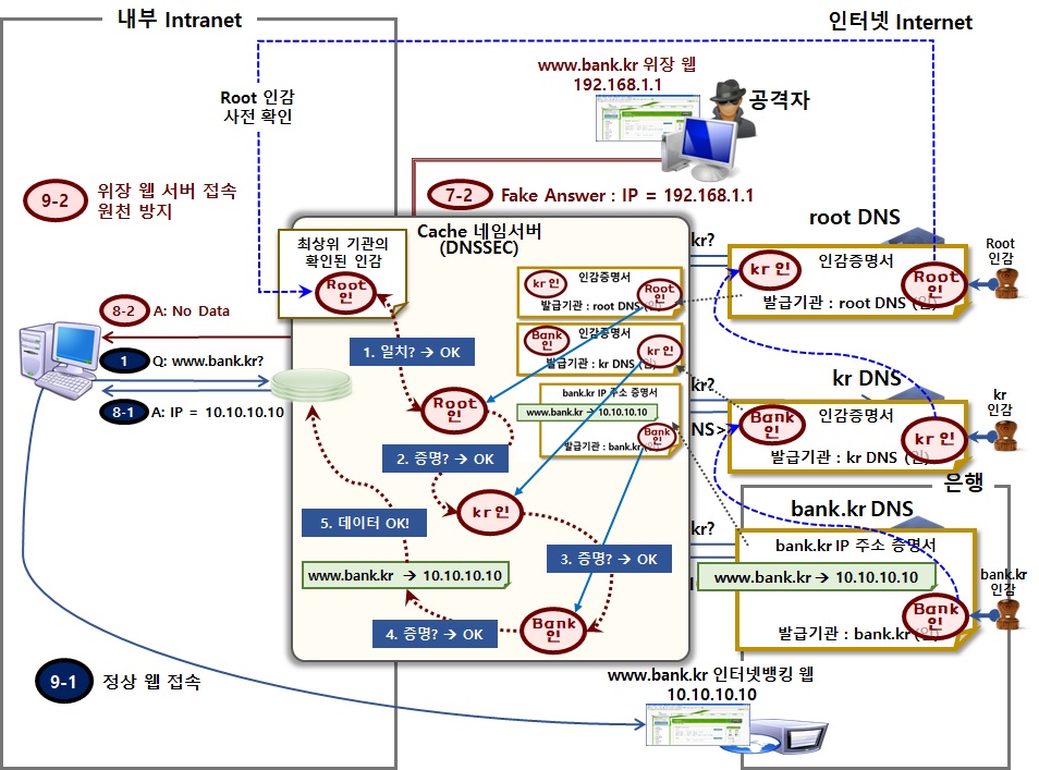 캐시 DNS서버는 루트 도메인 존부터 최종 검증대상인 www.test.co.kr의 A 레코드 데이터까지 순차적으로 서명 검증하여 모두 이상이 없음을 확인한 연후에 이 데이터를 비로소 신뢰하여 처리하게 됩니다.