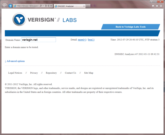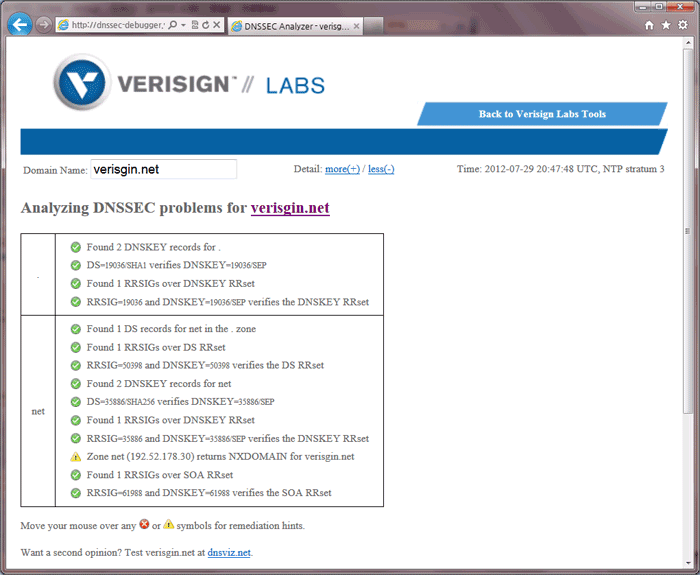 베리사인(Verisign) 연구소에서는 DNSSEC 서명적용된 도메인에 대하여 DNSSEC 설정 및 서명검증 오류여부를 체크해 주는 온라인 서비스인 "DNSSEC Analyzer"를 제공하고 있습니다.