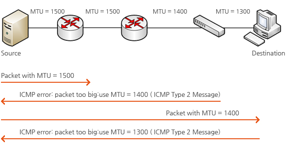 PMTUD란 목적지로 가는 경로상에 존재하는 링크들 중 MTU 값이 가장 적은 링크의 MTU 값을 확인하는 과정을 말한다.IPv6에서는 오직 출발지 장비만이 IPv6 패킷을 분할할 수 있도록 규정해 놓았다. 그 이유는 IPv4에서 목적지로 가는 경로상의 중간 라우터들이 무분별한 분할을 수행함으로 인해 발생했던 라우팅 속도 저하를 막기 위해서다.