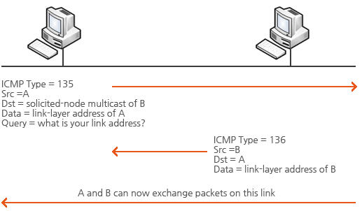 A는 B와 통신하기 위하여 상대방의 MAC 및 링크 로컬 주소를 알아야 하기 때문에 A는 B에게 자신의 링크 로컬 주소를 기반으로 Solicited node multicast 그룹으로 NS 메시지를 전송한다.B는 NS 메시지를 전송 받은 후 A에서 요청한 MAC 및 링크 로컬 주소를 NA 메시지를 통하여 응답해준다. 이때 B는 A의 링크 로컬 주소를 알고 있기 때문에 출발지를 자신으로, 목적지를 A의 주소로 설정하여 메시지를 전송한다.A와 B가 서로의 정보를 모두 주고 받으면 IPv6 neighbor 정보에 MAC과 링크 로컬 주소가 등록되어 서로 통신이 가능하게 된다.