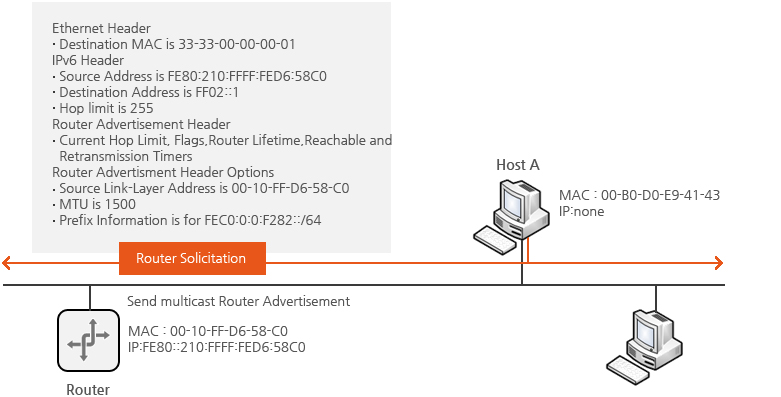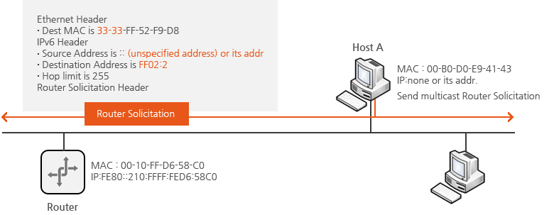 RS는 글로벌 주소를 생성하기 위하여 현재 라우터가 사용하고 있는 글로벌 prefix를 요청하는 메시지로 출발지 주소는 자신의 링크 로컬 주소 혹은 미 확정 주소(::)를 이용하며 목적지 주소는 all router multicast 주소를 사용한다.
